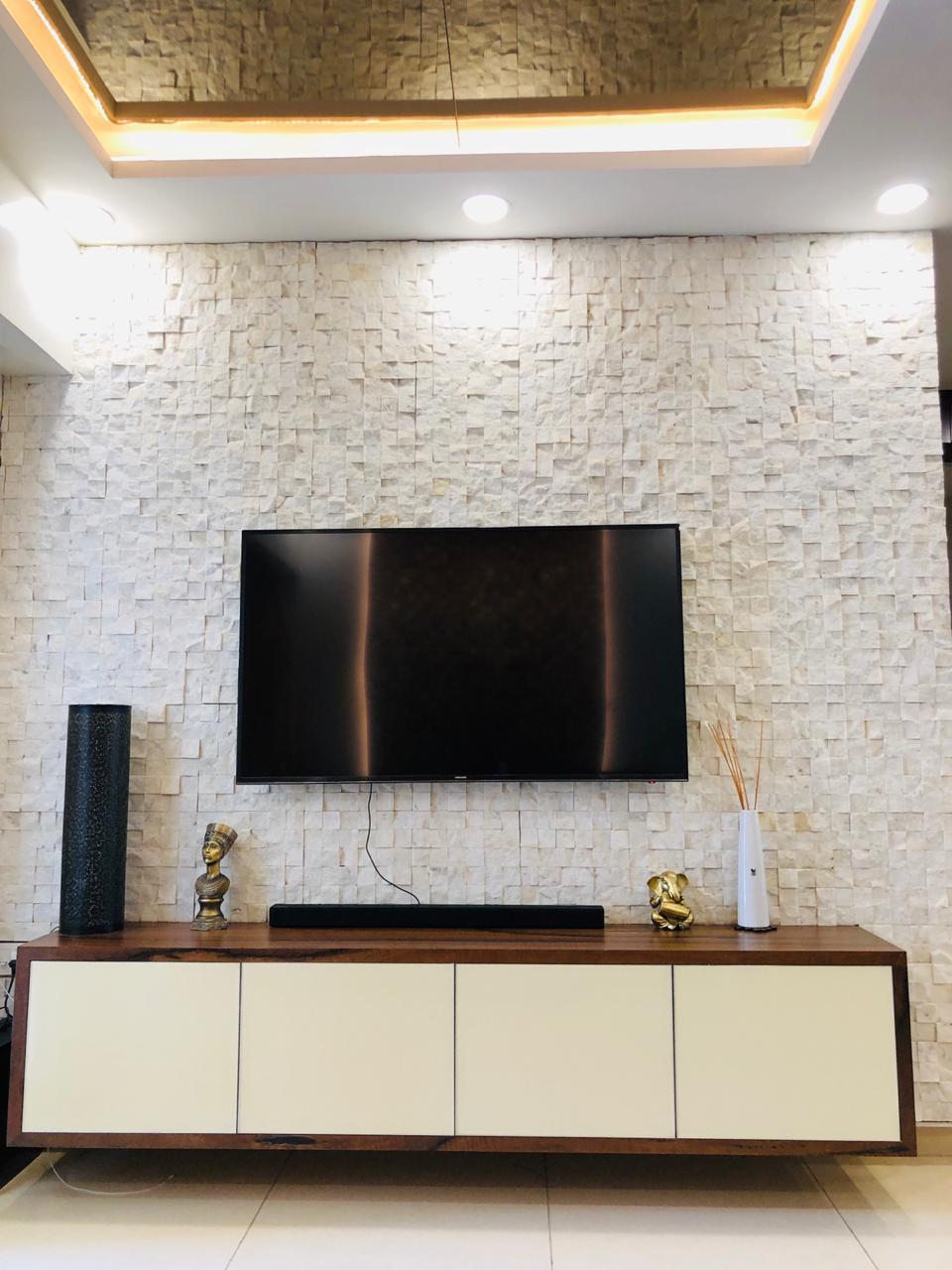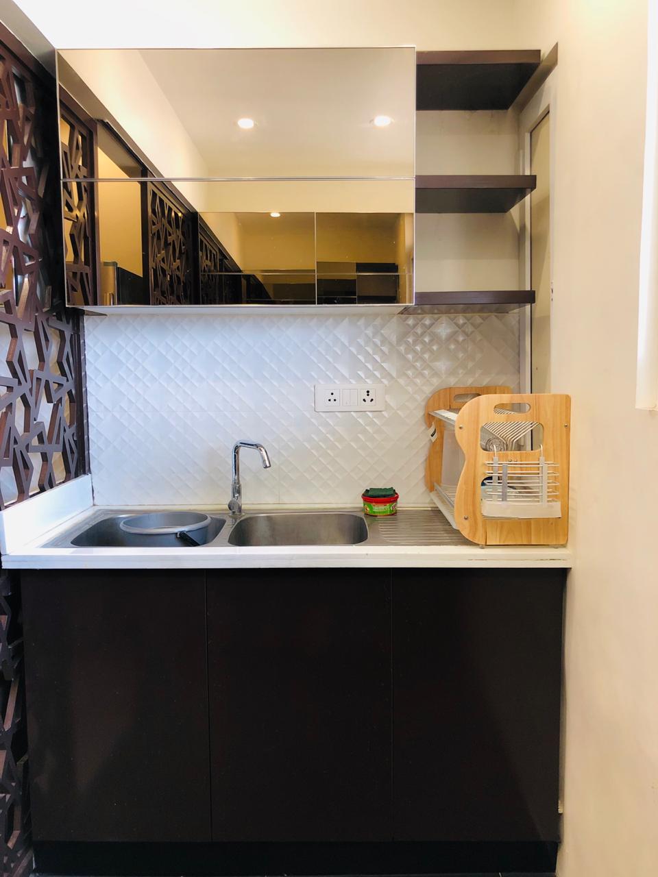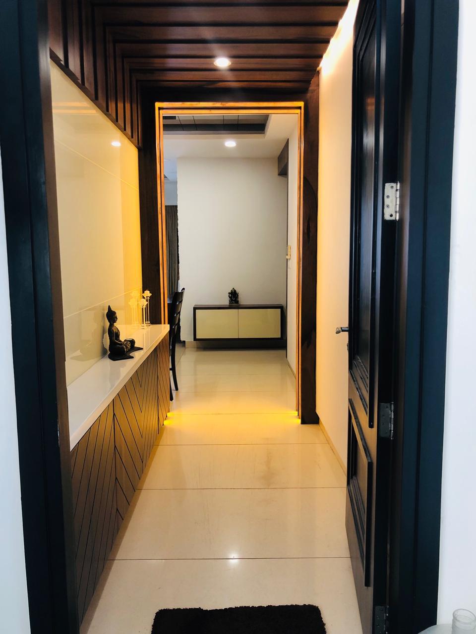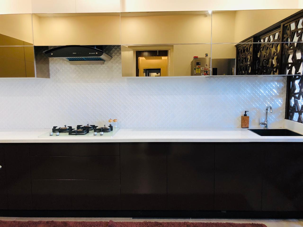 We designed this 3bhk residence where opulence and comfort meet at every turn. We started off by using neutral colors with leather sofa, stone cladded walls and mirror cladding in walls & ceiling. The grandeur of the foyer unwinds into the well-lit living room. The kitchen cabinets are designed with duco lower cabinets and mirror finished upper cabinets.