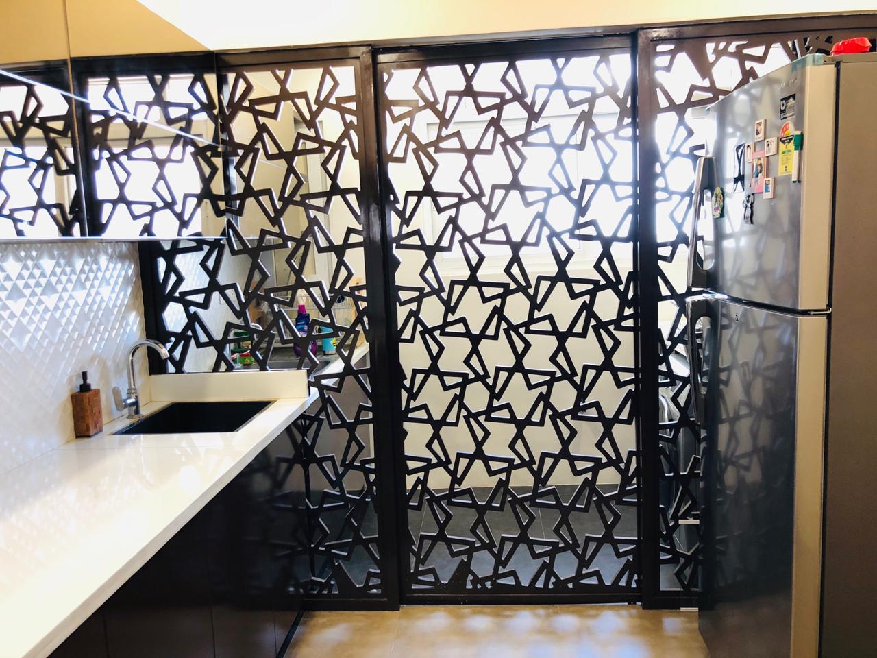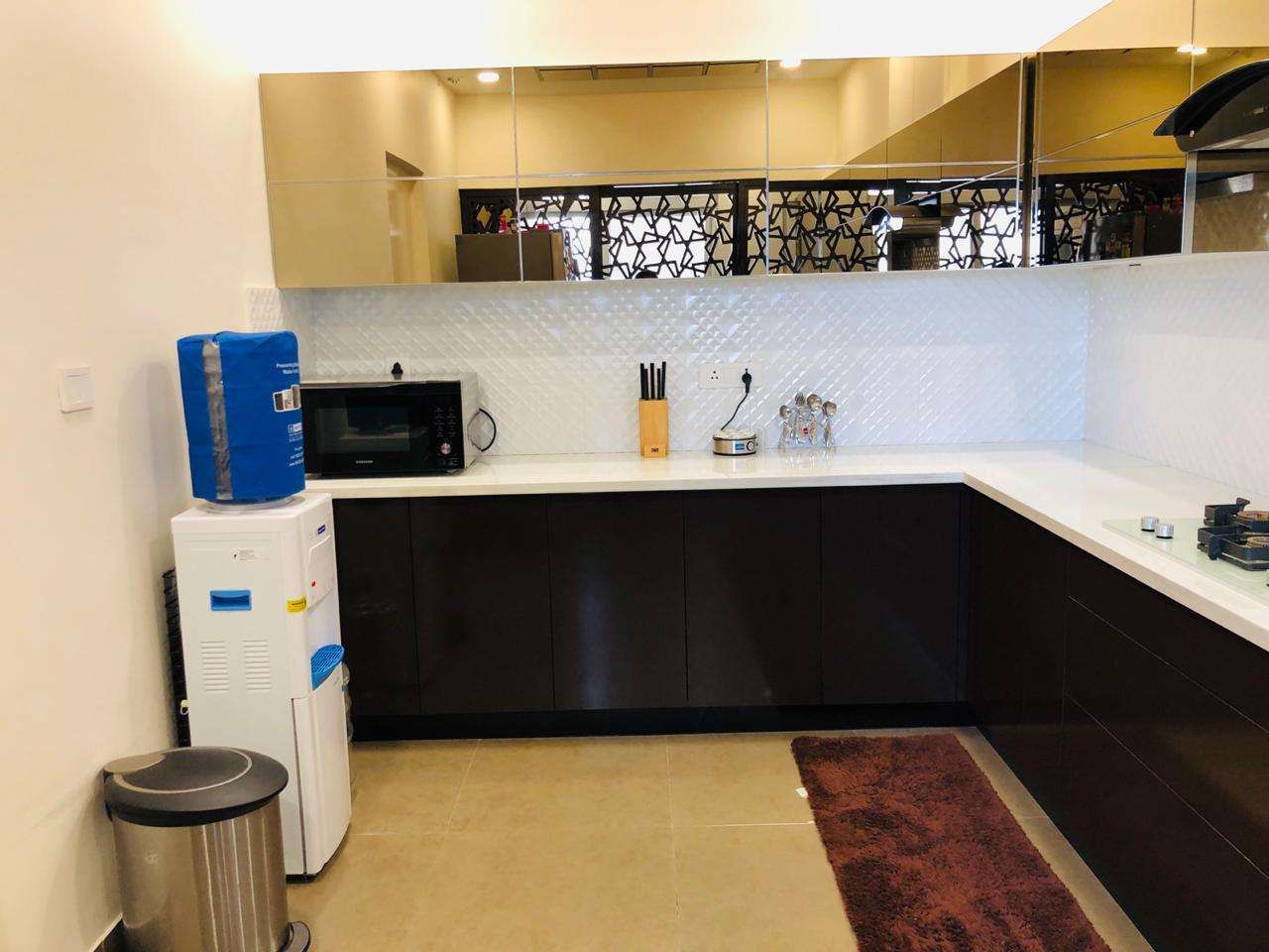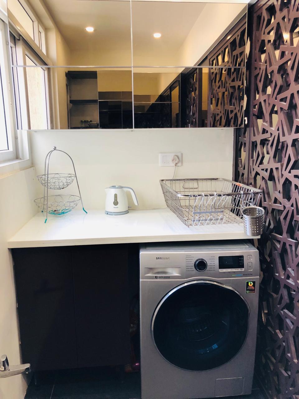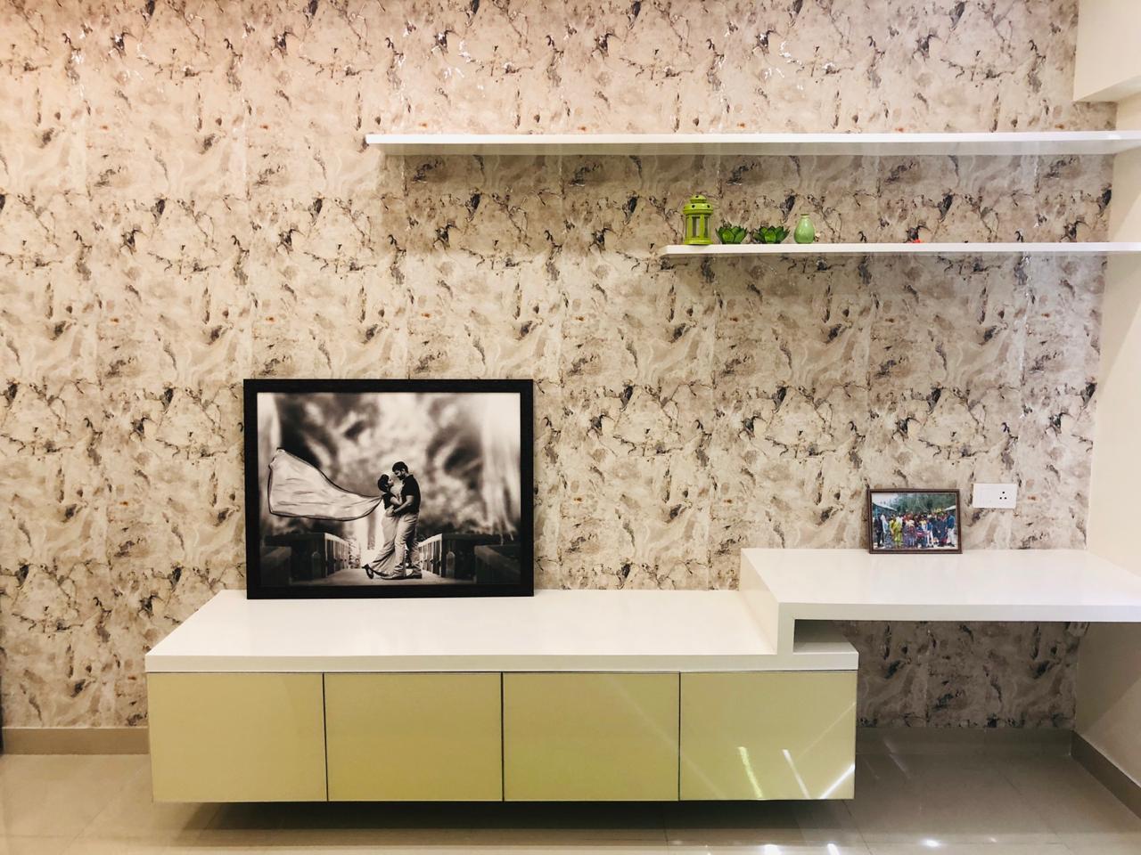We designed this 3bhk residence where opulence and comfort meet at every turn. We started off by using neutral colors with leather sofa, stone cladded walls and mirror cladding in walls & ceiling. The grandeur of the foyer unwinds into the well-lit living room. The kitchen cabinets are designed with duco lower cabinets and mirror finished upper cabinets.