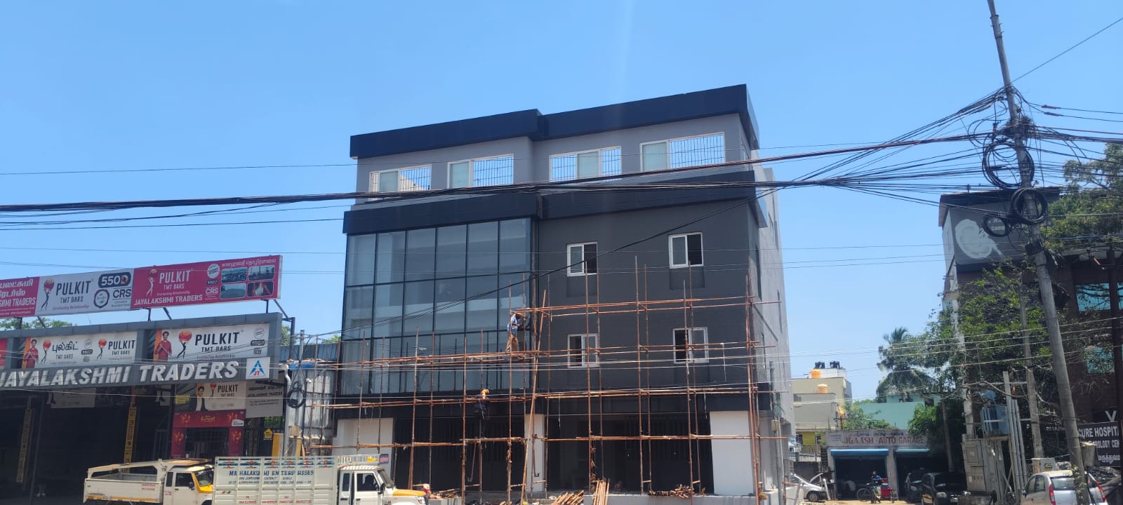 The completed building successfully meets the client’s expectations with a strong, modern design and high-quality construction. The sleek glass frontage enhances the visual appeal, while the spacious and well-ventilated interiors provide flexibility for commercial use.Secure shutter gates on the ground floor ensure safety, and the use of premium materials ensures long-term durability with minimal maintenance. Overall, the project was delivered on time, with excellent structural integrity and a professional finish.