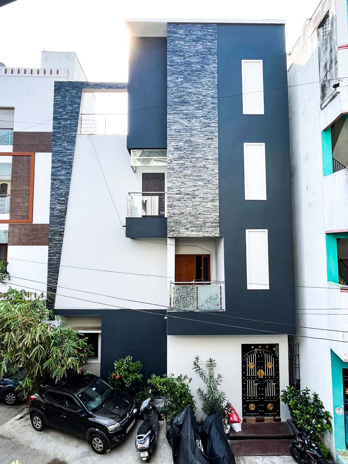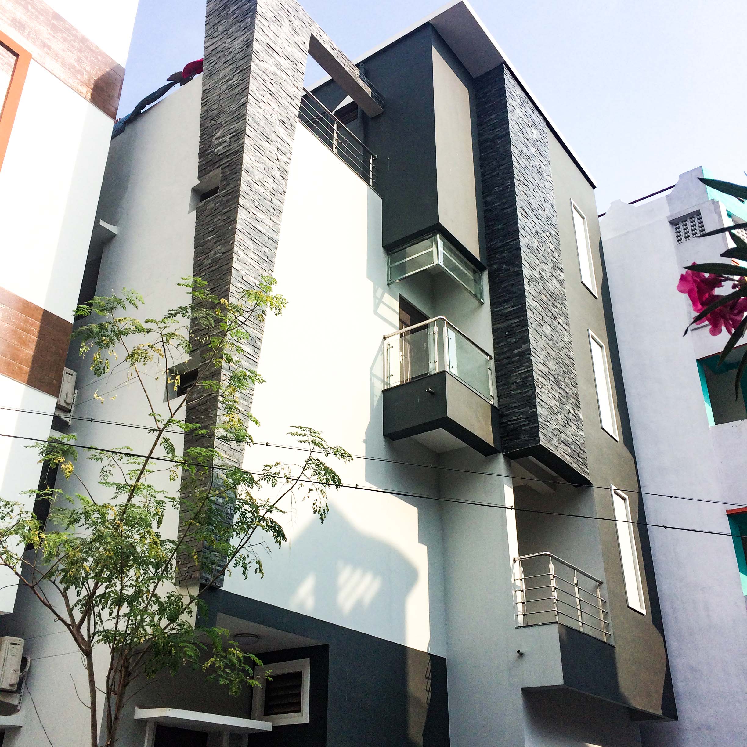 This three-storey modern residence showcases geometric forms, stone-textured cladding, and vertical glass windows. It includes glass balconies, a terrace, a commercial shutter, and a gated entrance.
