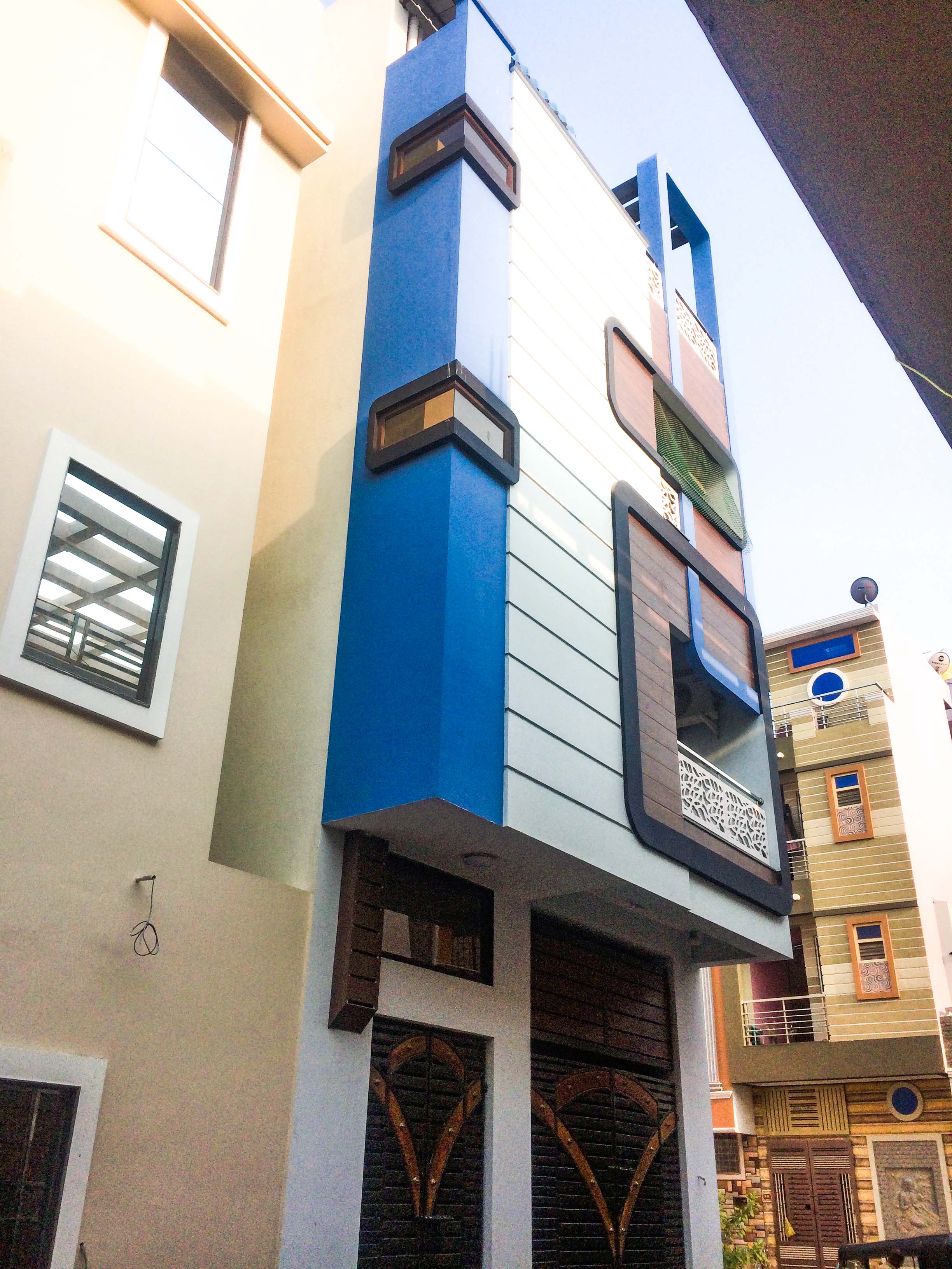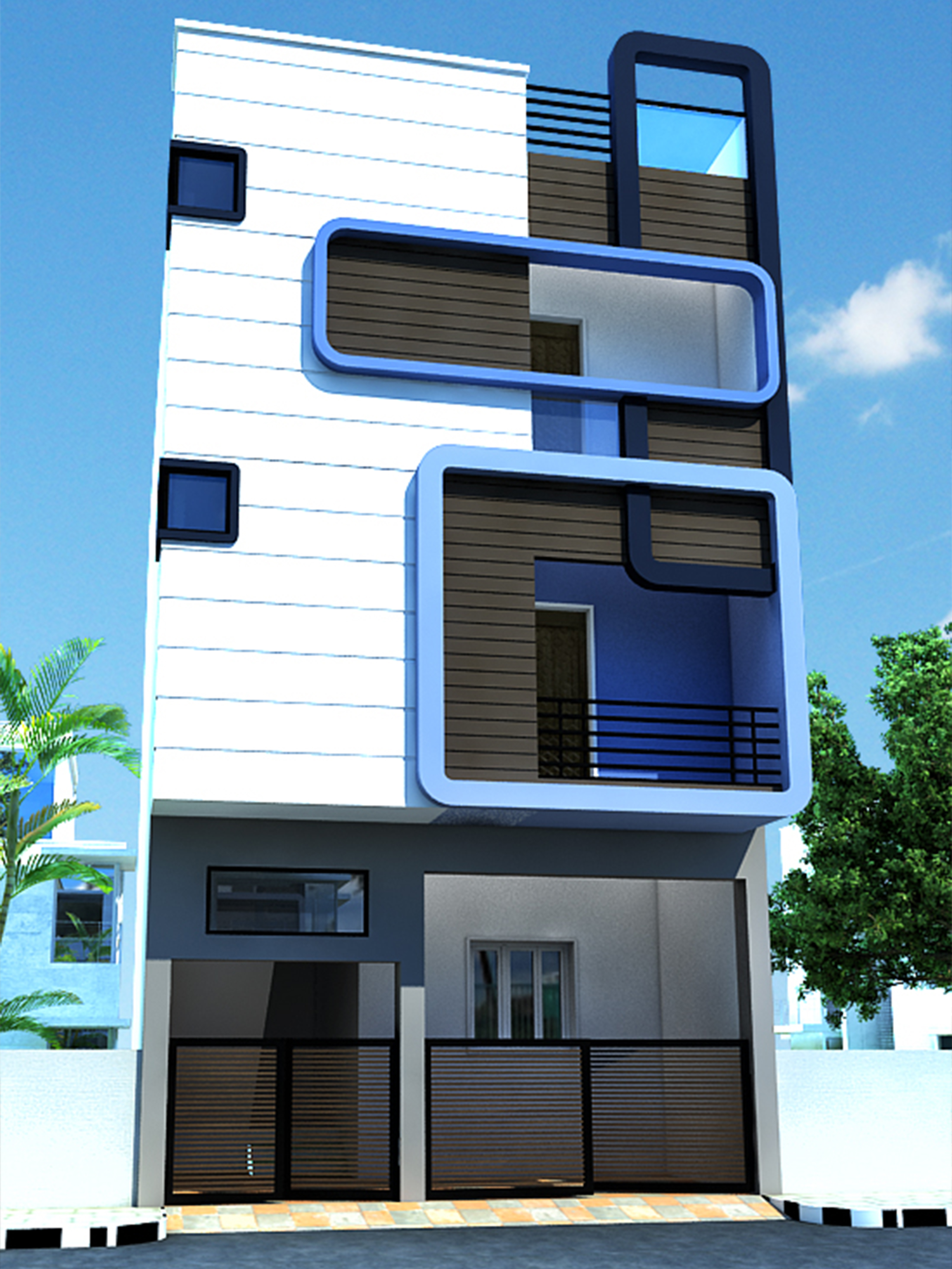 This G+3 residential structure features a striking modern façade with geometric balcony frames, sleek textures, The layout is optimized for comfortable family living across all floors.