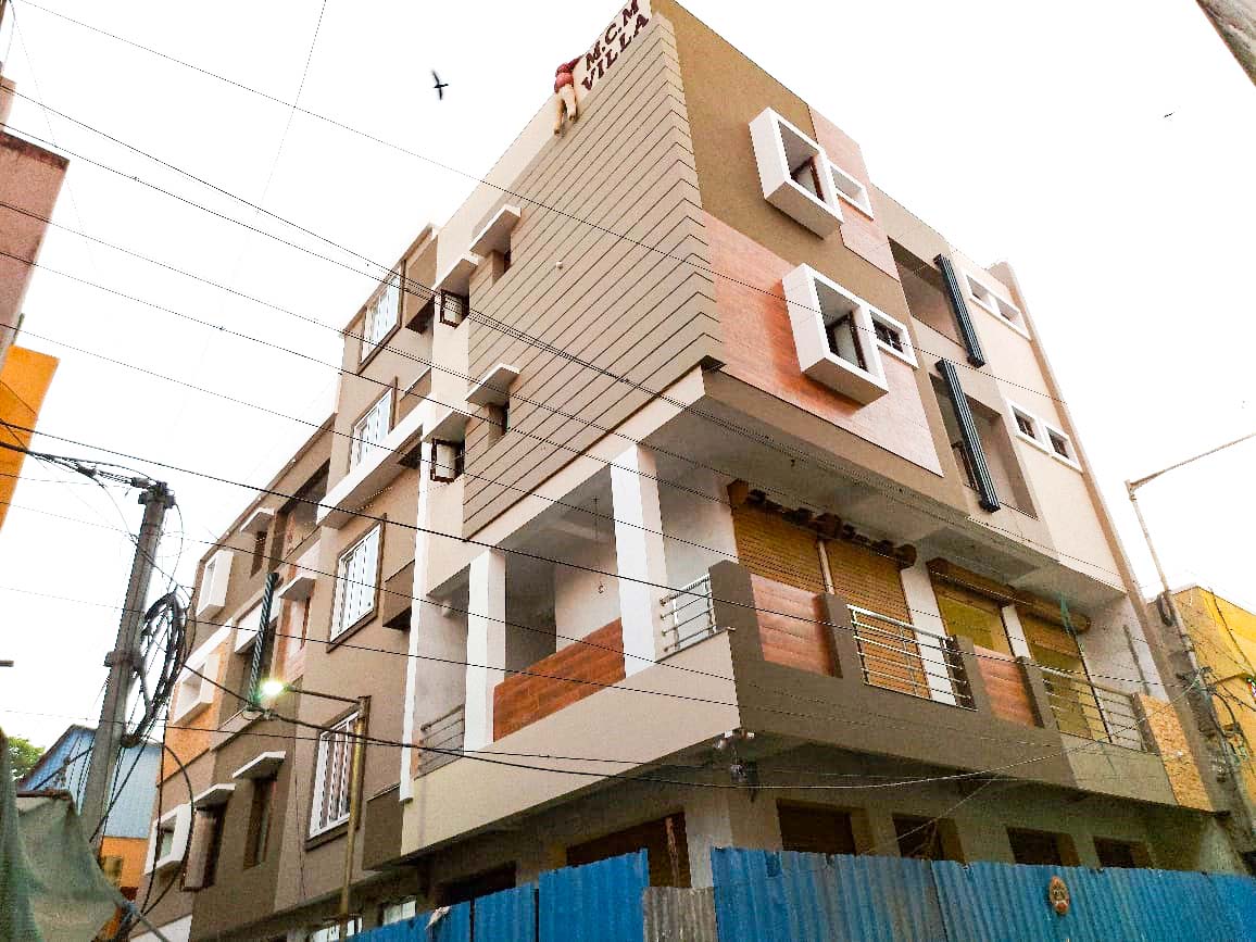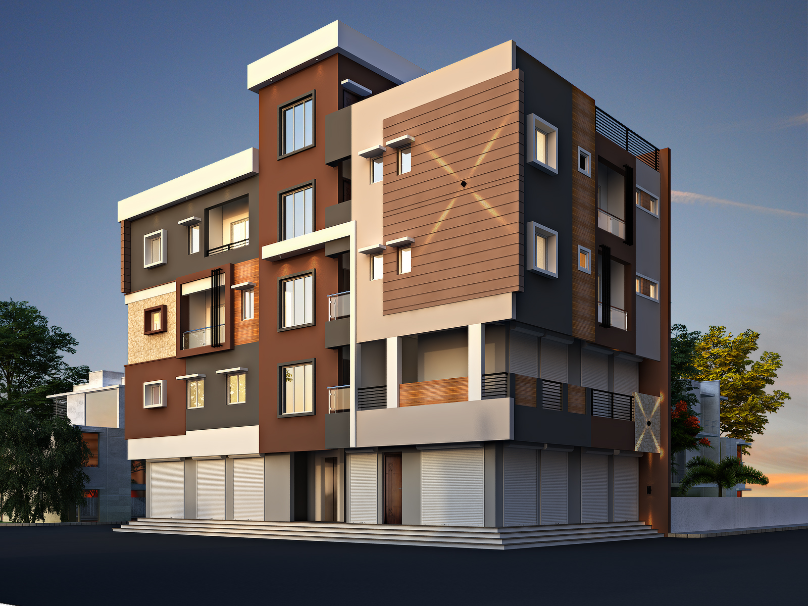 This is a four-floor building with shops below and homes above. It has a modern look with stylish windows, and neat balconies.