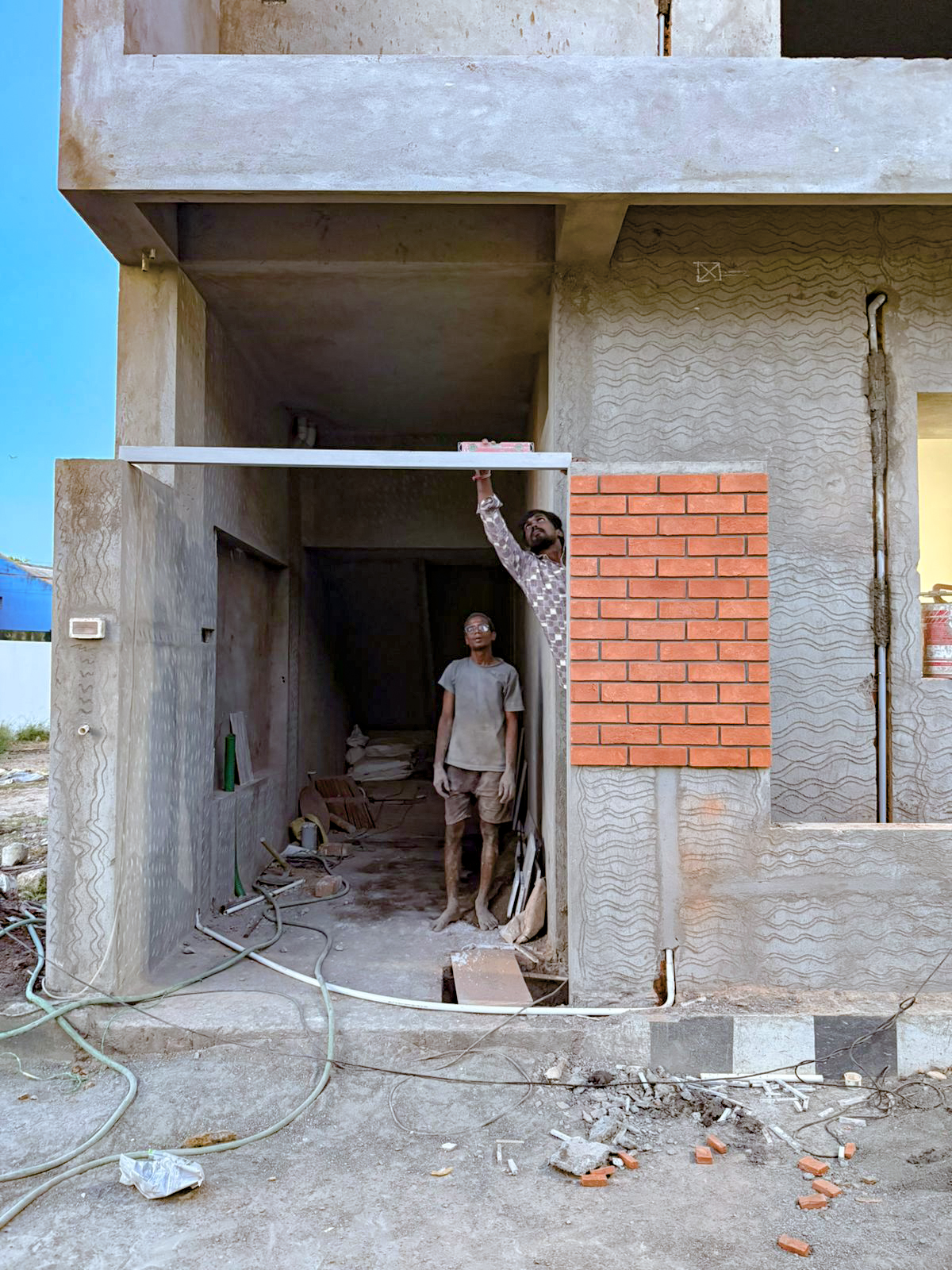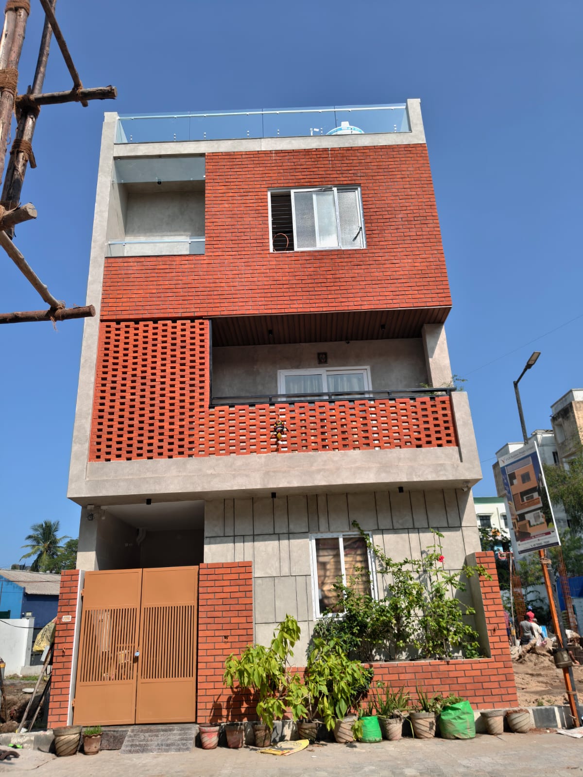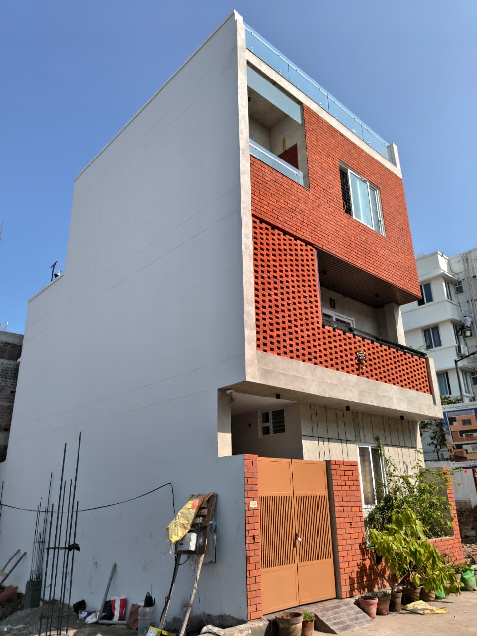 A G+2 residential building designed with a modern blend of exposed brick and concrete finishes.