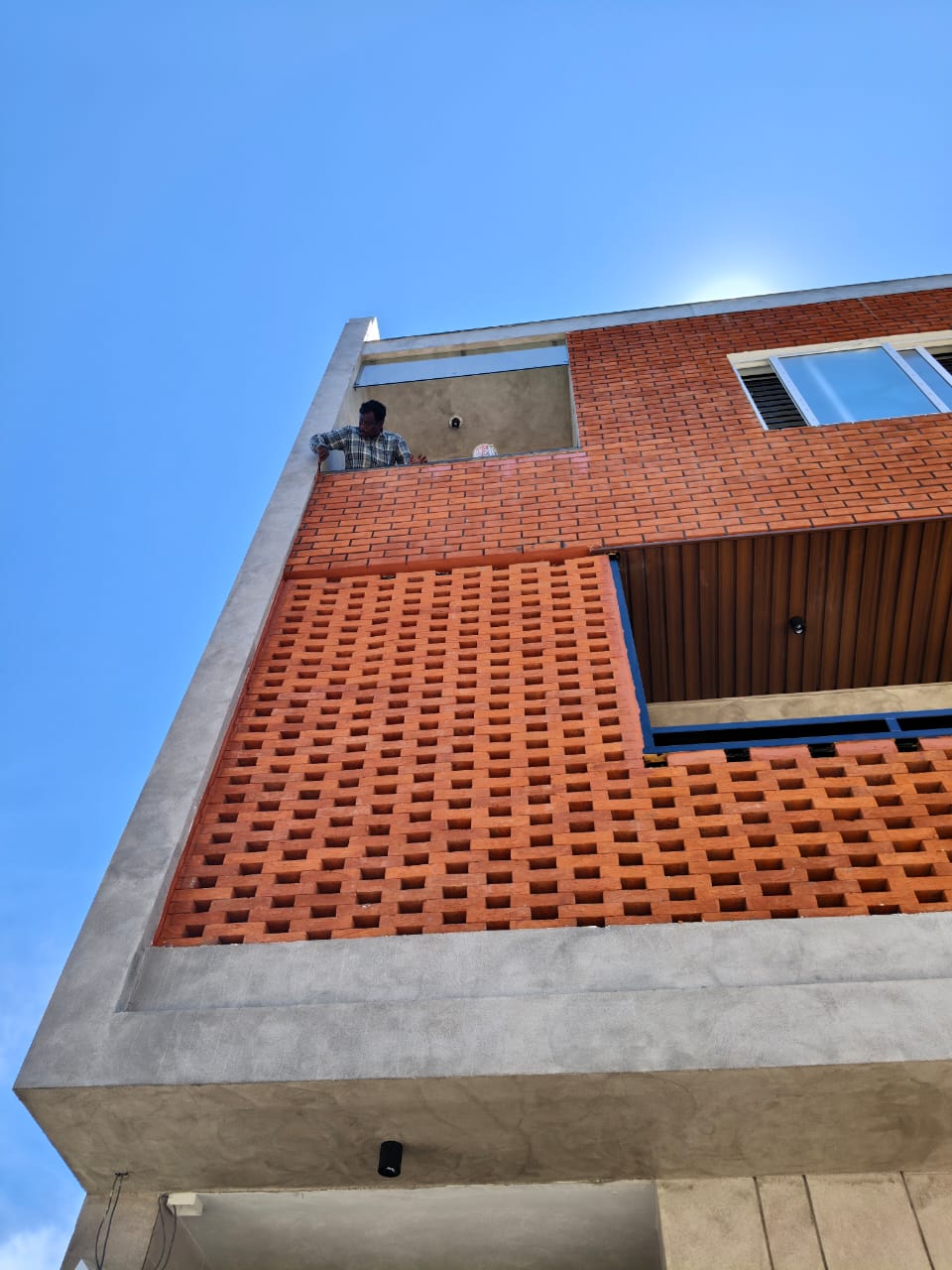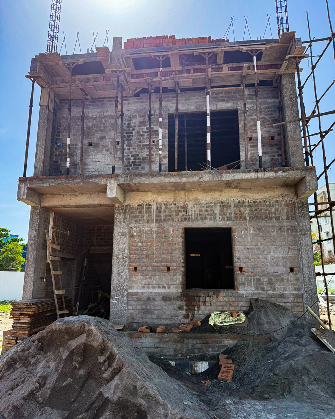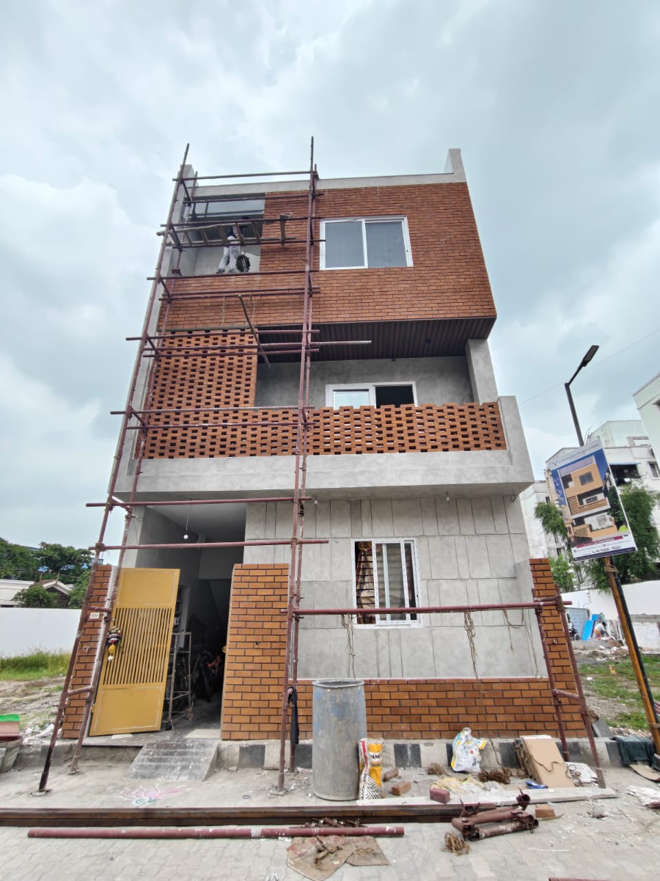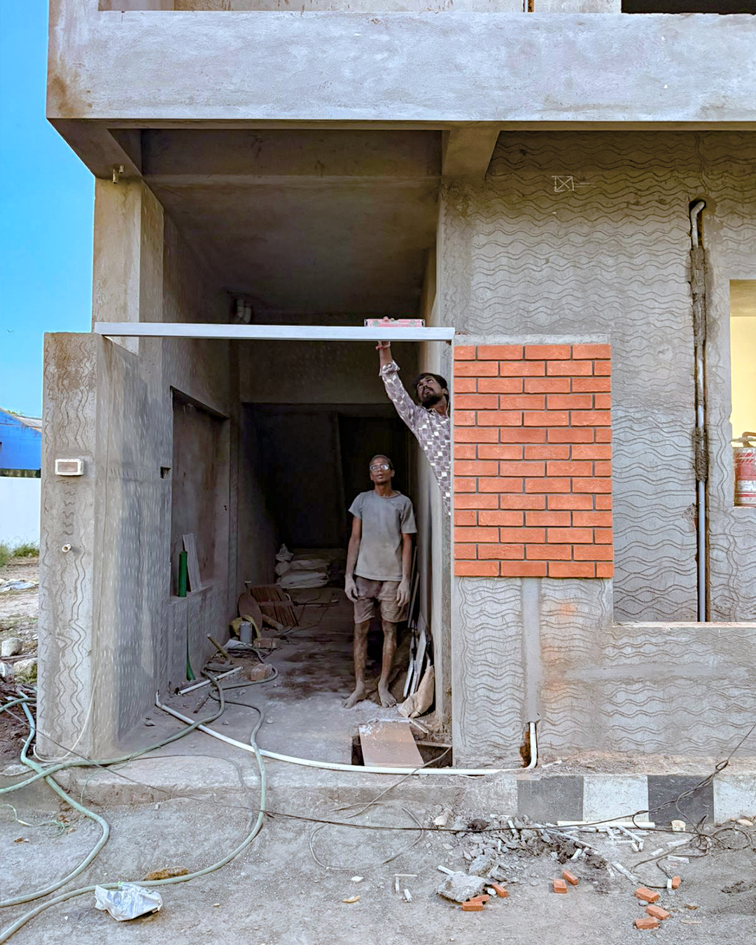 A G+2 residential building designed with a modern blend of exposed brick and concrete finishes.