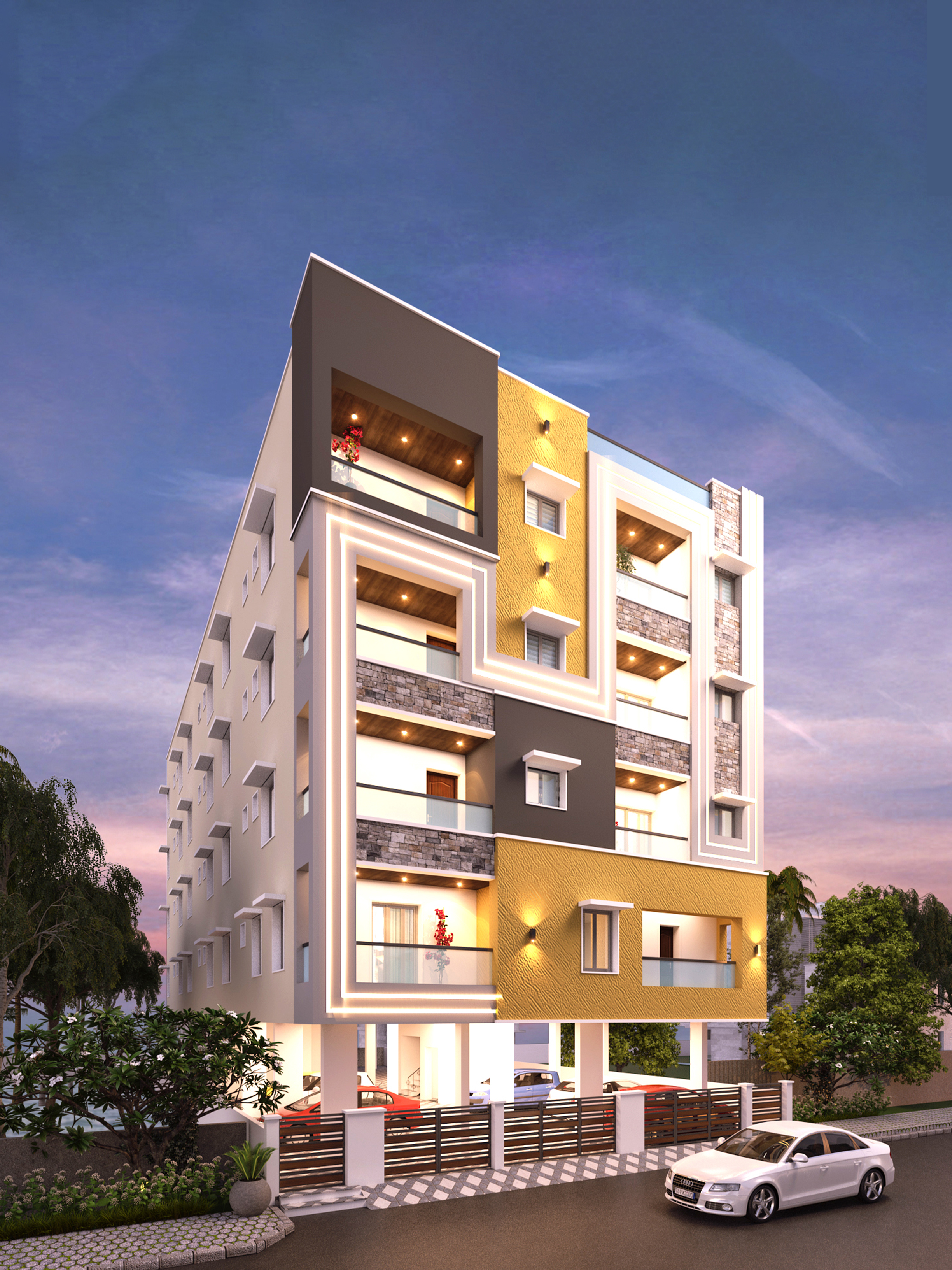 This G+4 residential building showcases a stylish modern elevation with glass balconies. The stilt floor offers dedicated parking, enhancing both utility and elegance.