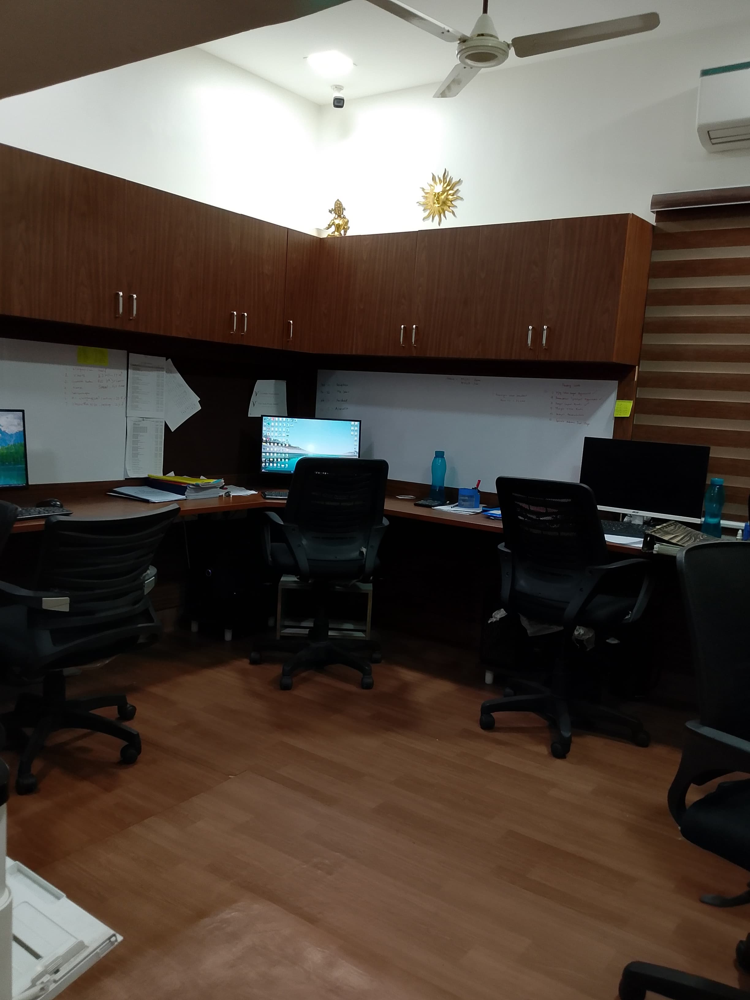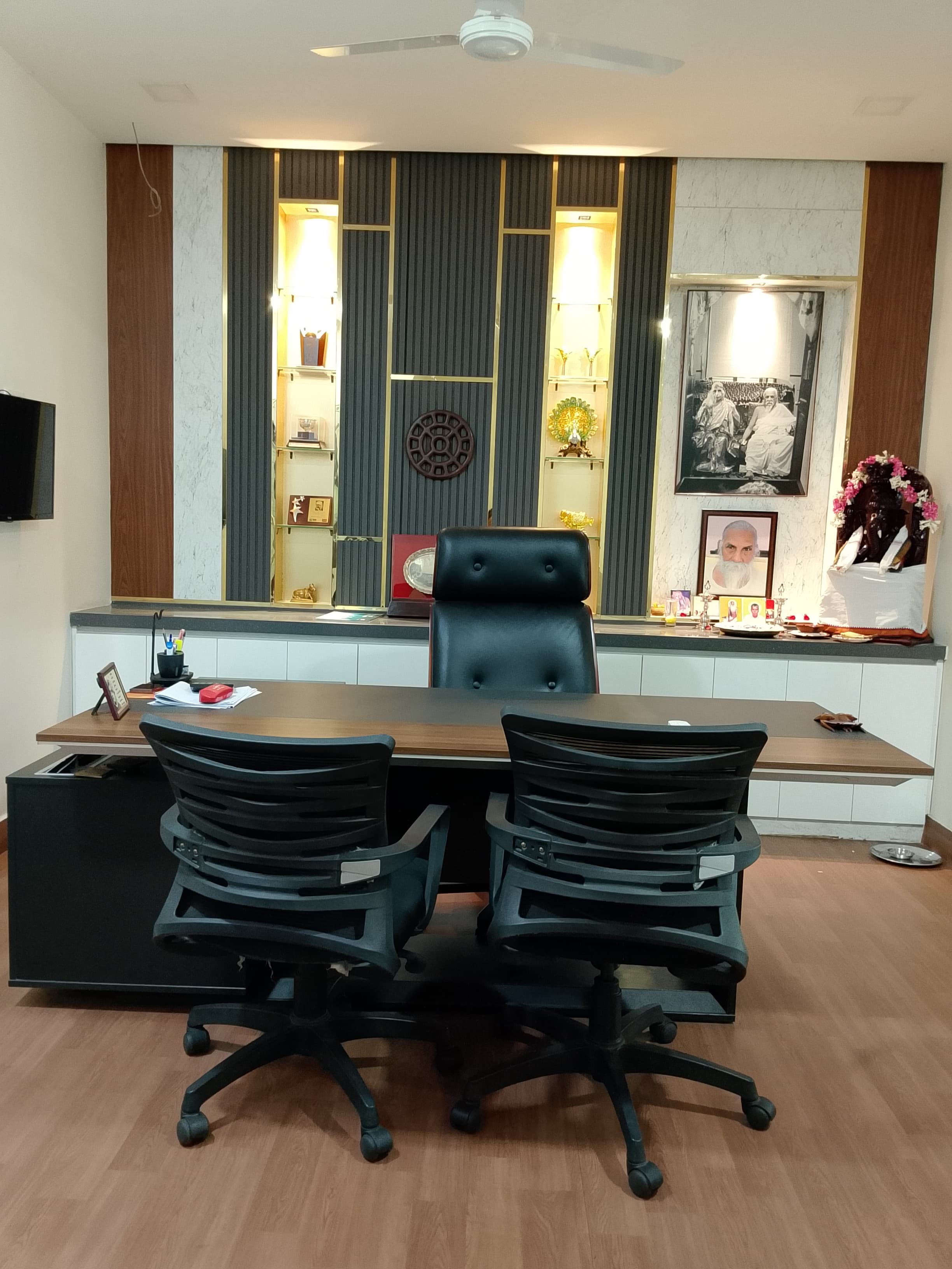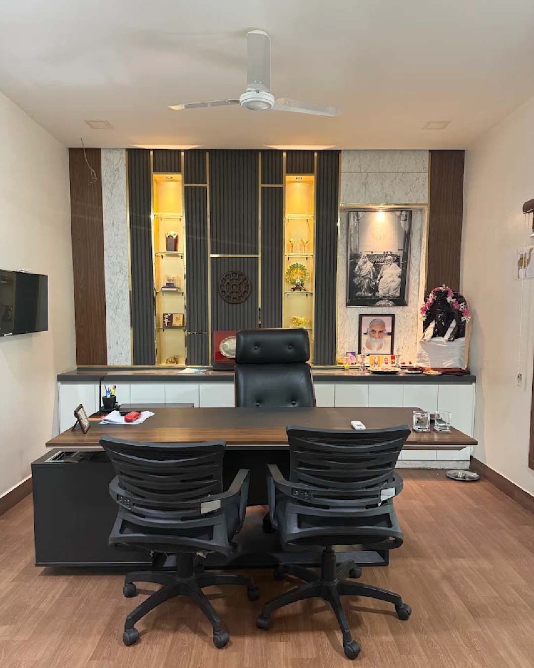 The completed office interiors showcase a professional, practical, and visually pleasing design. Each space is planned for maximum efficiency, featuring sturdy furniture and a unified wood-toned style that adds warmth and elegance. Workstations are set up ergonomically for comfort and productivity, with plenty of storage and neatly managed wiring for a tidy environment. The reception area stands out with a sleek, modern counter and stylish accent wall. Executive cabins are crafted with premium materials, built-in display units, and well-planned lighting for a refined corporate look. Overall, the project delivers a well-finished, ready-to-use office that combines functionality with style.